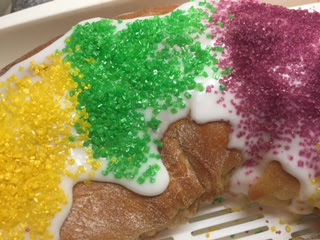 King Cake, we were told, is eaten from epiphany until Mardi Gras, and represents the three kings who went to visit the baby Jesus. It is made from a sweet dough that is sprinkled with cinnamon and sugar and rolled up into a ring or crown shape, then always decorated with the same three colours - purple, which symbolises justice, green, which represents faith, and gold for power.